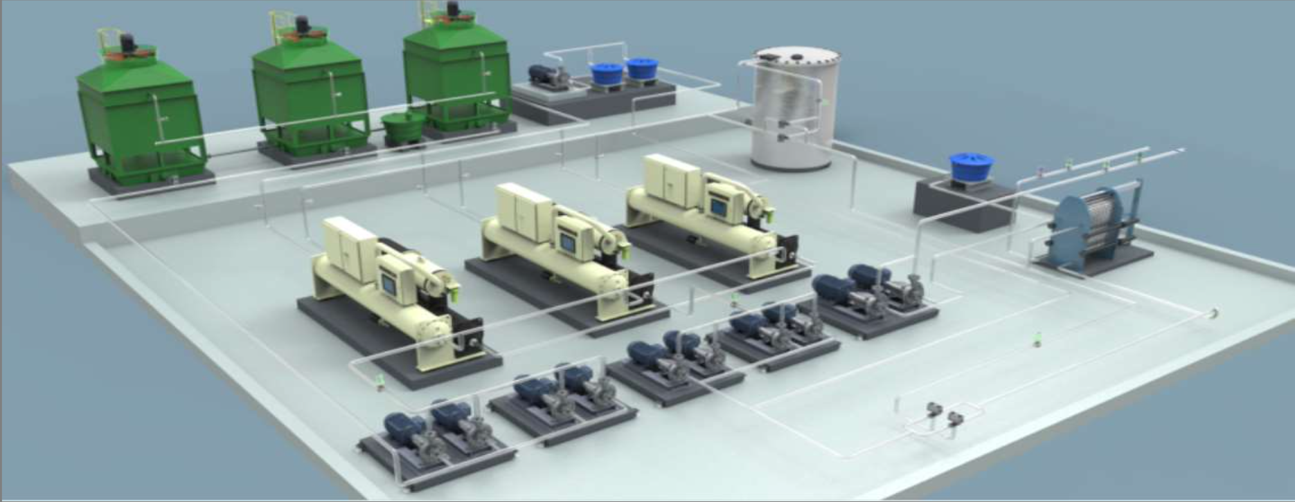 Tratamento e controle de sistemas de resfriamento e água gelada, prevenindo bioincrustação, corrosão e perda de eficiência térmica.